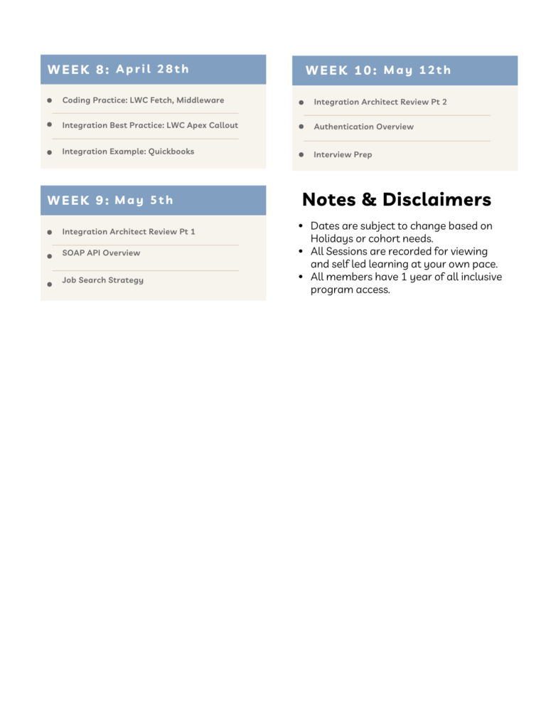 We facilitate live instructor-led Salesforce Integration Architect Certification study sessions, including everything you need to not only pass the exam but put the content into real-world application! All live sessions are recorded so you can review them at your convenience.
