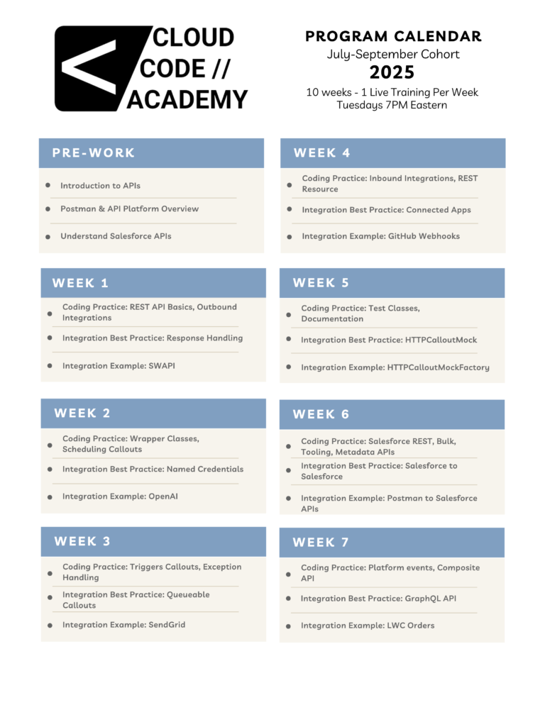 The Cloud Code Salesforce Integration Program is your key to not only becoming Salesforce Integration Architect Certified but truly being capable of Developing Real World Integrations for your clients!